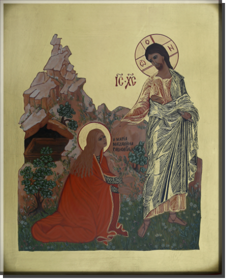 Maria Magdalena steht vor dem leeren Grab dessen schwerer Grabstein verschoben wurde und weint, da sie befürchtet, man hätte den Körper von Jesus gestohlen. Sie hört Schritte und vermutet erst den Gärtner der diesen Garten pflegt. Doch es ist Jesus, der sie mit ihrem Namen anruft: "Maria!" Daraufhin erkennt sie ihn und antwortet "Rabbuni!" (Geliebter Meister). Jesus spricht zu ihr "Halte mich nicht fest, denn ich bin noch nicht aufgefahren zum Vater." Jesus beauftragt Maria Magdalena zu seinen Jüngern zu gehen und ihnen zu verkünden, dass er auferstanden ist und zu seinem Vater und ihrem Vater zurückkehrt. Aufgrund dieses Auftrags gilt Maria Magdalena als erste Zeugin der Auferstehung und der Verkünderin der Osterbotschaft.